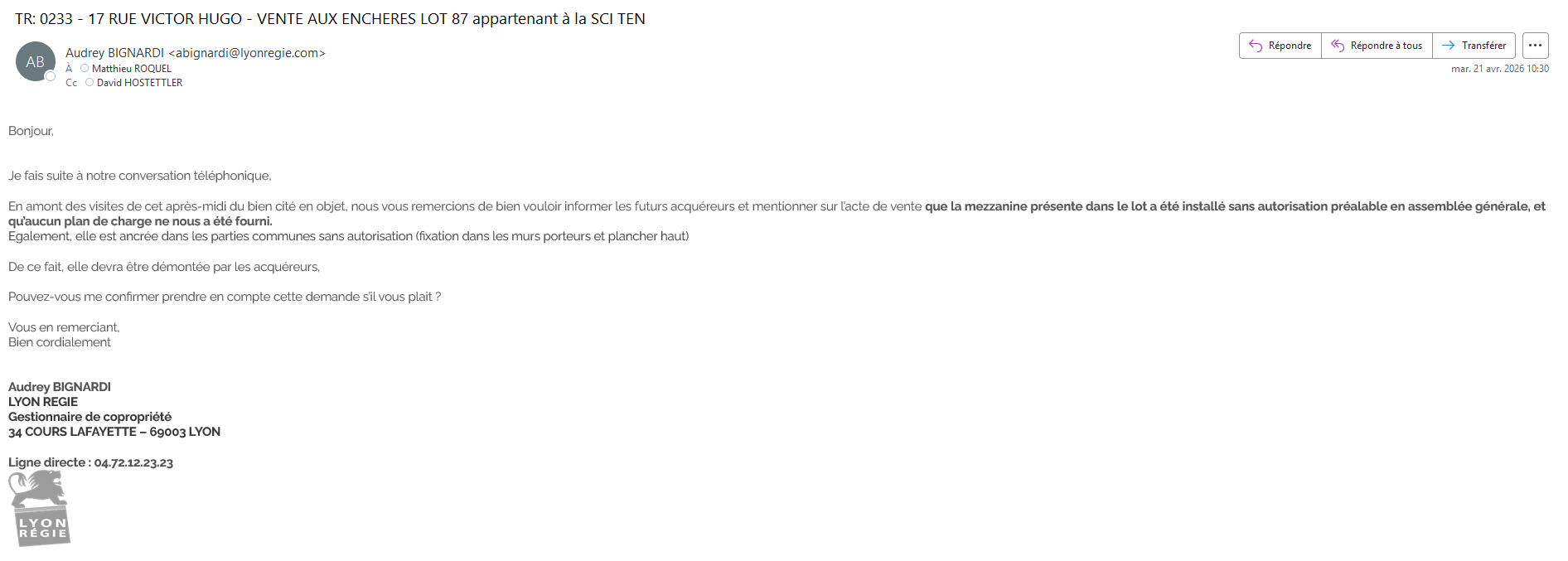 VENTE DU 04.06.2026: Plateau de logement 34,55 m² - LYON 2 (69002)